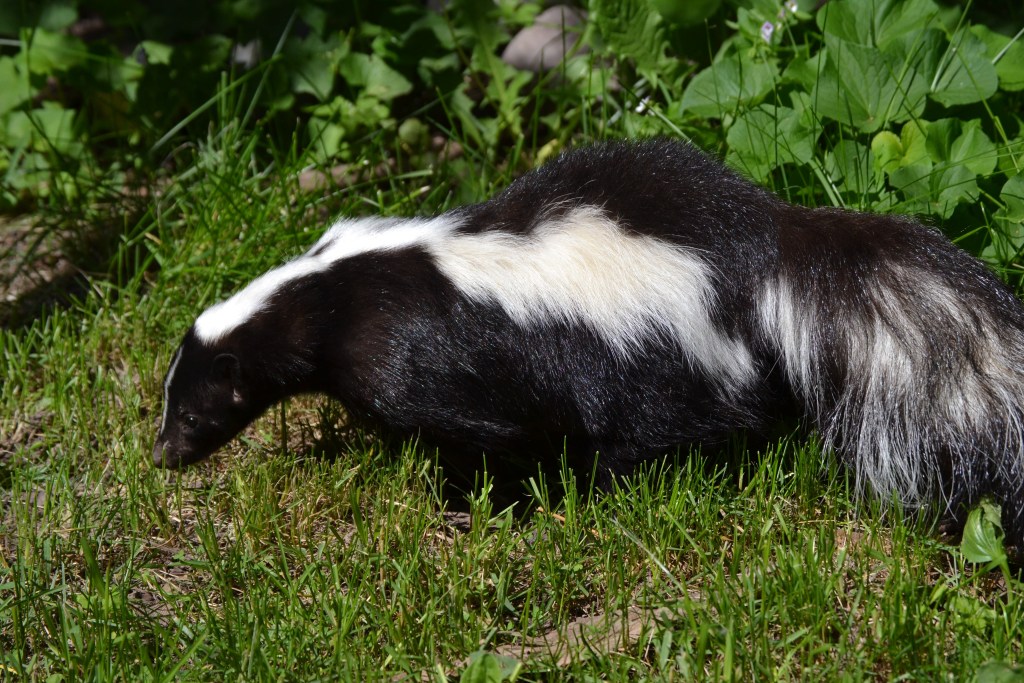 Striped skunks are small to medium-sized mammals, easily recognized by their bold black fur with white stripes running from head to tail. They have a stout body, short legs, and a bushy tail, which they can raise dramatically when threatened. Skunks are primarily nocturnal and omnivorous, feeding on insects, small mammals, fruits, and vegetation. Despite their infamous scent, skunks are intelligent, inquisitive, and capable of fascinating behaviors that make them compelling subjects for wildlife observation and photography.