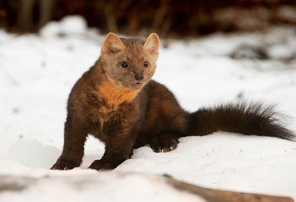 Martens are a slender weasel with a bushy tail, and a pointed face. They have short legs with rounded ears and large black eyes. The legs are darker than the body. The winter coat is dark brown with a bright orange throat patch while the summer coat is lighter in color and not as thick.